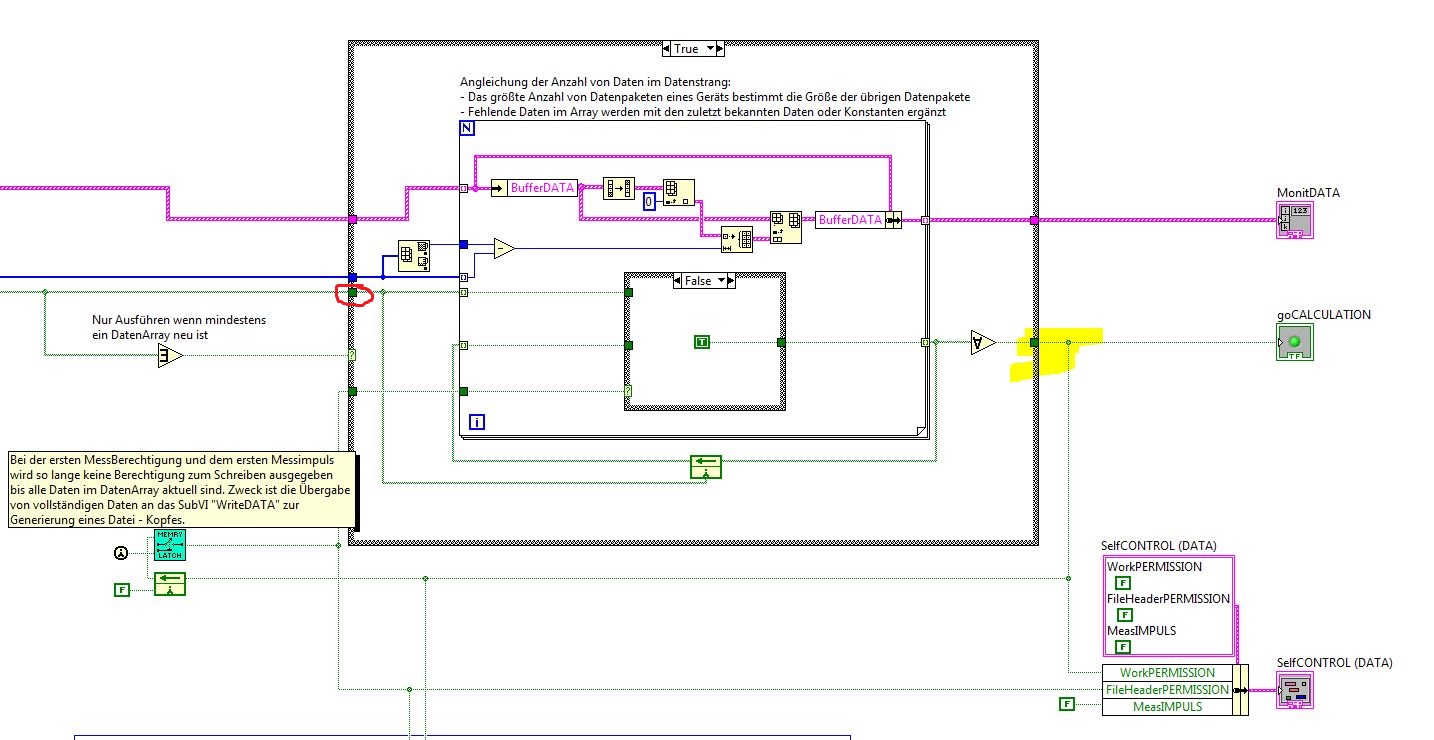 Aber während das Sub-VI einmal durchläuft, sprich die Schleife den ganzen Datensatz abklappert, ist first call die GANZE Zeit true? Wirklich erst dann, wenn das VI erneut, mit einem neuen Datensatz angesprochen wird, schaltet es auf false? Das ist das kleine Detail, das mir noch nicht ganz klar ist. Mich verwirrt da nämlich die Kontexthilfe "Zeigt an, wenn ein Sub-VI oder Blockdiagrammabschnitt das erste Mal abläuft." An der Stelle frage ich mich eben, ob das wirklich nur EINMAL der Fall ist, wenn ein neuer Datensatz durch die Schleife läuft. Dann würde ja auch Memory Latch noch einmal ausgeführt werden. Ich denke mir schon selbst, dass das Kappes ist. Dann würde es ja eine Schleife ausführen, ohne in einer zu liegen. Ich will mich da nur vergewissern. Sorry, dass das vllt auf den ein oder anderen ziemlich stumpf wirkt, aber mir muss eben 100% klar sein, wann der Schleifenausgang false ist zwecks Schreiberlaubnis...