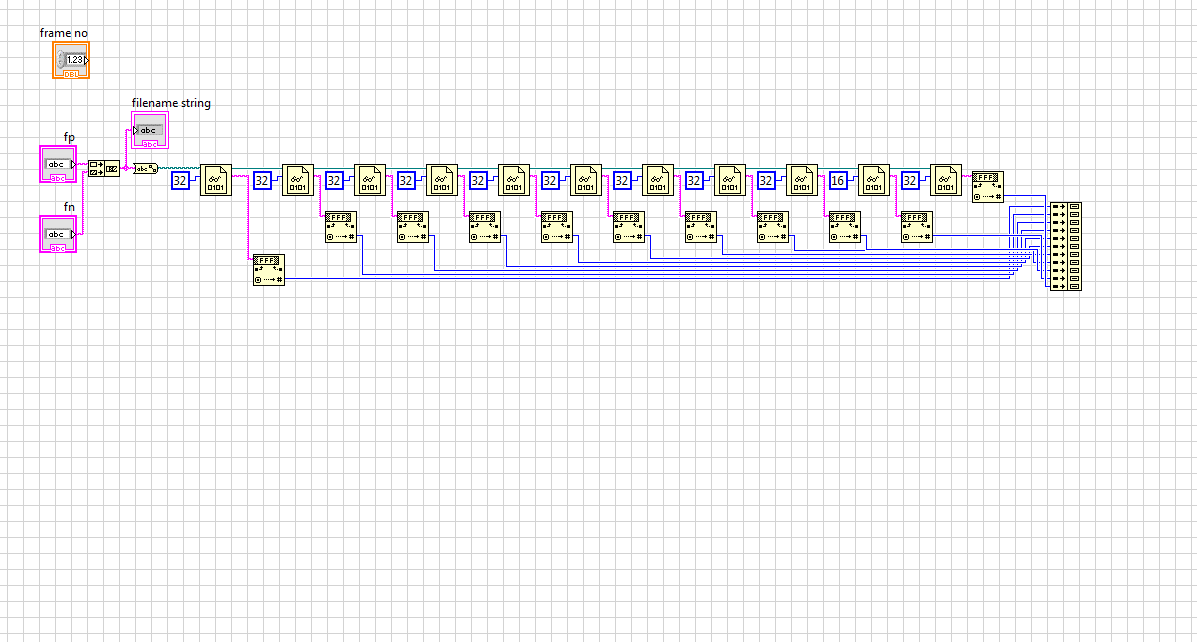 Ich möchte aus einer binären Datei (weiß sonst keinen Weg, wie ich es sonst machen soll, ist ein seltenes Dateiformat) Daten einlesen und sie dann wieder als Integers in einem Cluster ausgeben. Fast alle Daten sind im 32er-Format. Da ich noch nicht so lange mit LabView arbeite, poste ich hier einmal das, was ich versucht habe. Keine Ahnung, ob es stimmt oder ob es Müll ist.