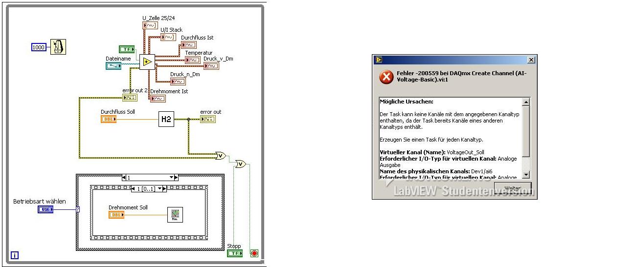 ich schreibe die Software für einen Prüfstand in Labview. Es gibt bis jetzt einen Task, der mehrere Spannungen einliest und zwei Tasks, die eine Spannung ausgeben. Die Tasks sind jeweils SubVis. Das funktioniert in der im letzten Bild gezeigten Programmversion sehr gut. Als nächsten Schritt möchte ich nun den Ausgabetask "Drehmoment Soll" in eine Casestruktur bringen, da es hier verschiedene Anwendungsfälle gibt. Sobald ich die Casestruktur jedoch einfüge, bekomme ich abwechselnd an allen Tasks die Fehlermeldung: "Der Task kann keine Kanäle mit dem angegebenen Kanaltyp enthalten, da der Task bereits Kanäle eines anderen Kanaltyps enthält". Der in der Casestruktur versteckte Task wurde in diesem Fall noch gar nicht aktiviert. Ich verstehe nicht, was das Problem ist. Vielleicht kann hier jemand Licht ins Dunkel bringen Zum besseren Verständnis habe ich noch das Hauptprogramm mit Casestruktur und Fehlermeldung (erstes Bild) und die SubVis "Messen" (zweites Bild), "Drehmoment Soll" (drittes Bild) und "Durchfluss Soll" (viertes Bild) angehangen.