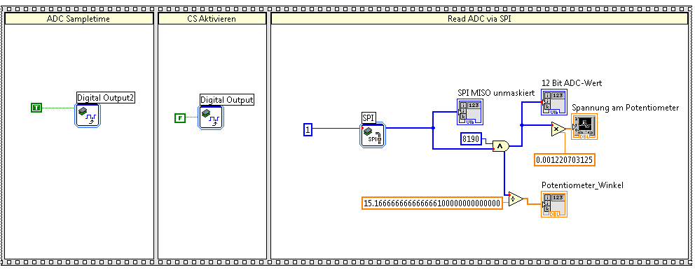 Ich bin momentan an meiner Abschlussarbeit: Einen Analogwert wird von einem 12Bit ADC eingelesen, und via SPI dem Datenerfassungstool myRIO weitergegeben. Der Wert wird nun im Labview verarbeitet, und dann wieder via SPI über das myRIO auf einem LCD angezeigt. Ich bin nun praktisch am Schluss mit der Realisation. Ich kann die Werte des ADC korrekt via SPI einlesen und im LabVIEW verarbeiten. Ebenso kann ich Zeichen welche ich in einen String schreibe, auf dem LCD ausgeben. Ich habe nun bei dem zusammenfügen dieser zwei Komponenten etwas Mühe: Das SPI-Interface verarbeitet 8Bit - Arrays. Der auszugebende Wert hat jedoch den Datentyp unsigned Word.