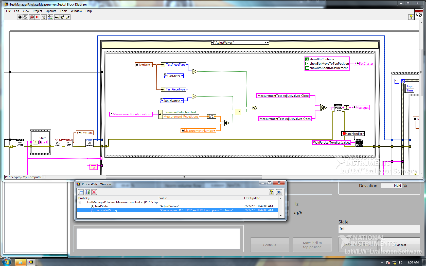 Das Bild wurde nach der Zuweisung an Messages aufgenommen und wie man sieht, zeigt die Probe einen Wert an, aber die Textbox im FrontPanel bleibt leer. Ebenso bei State: die Probe zeigt den aktuellen Wert "AdjustValves", aber im FrontPanel steht noch "Init".