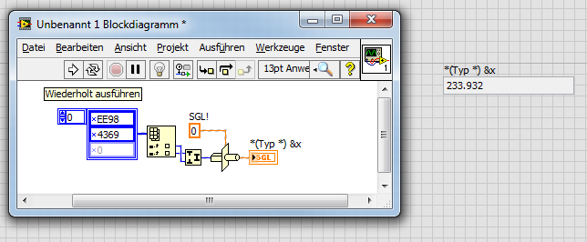 Ich lese hier von Adresse 0x4C den Wert der Netzspannung ein welcher auf dem Display des Jumo mit 230,085 angezeigt wird, mit dem Testprogramm von Jumo als 230,085 angezeigt wird, aber im LAbview in die millionen geht .... Irgendwie habe ich das Gefühl das es mit dem Gleitkomma noch nicht funktioniert Construction