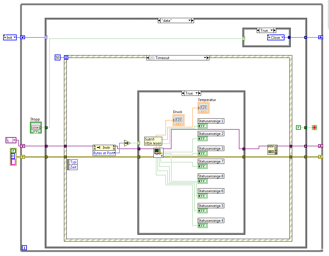 Eine Ereignisstruktur ermöglicht mir problemlos die Daten via VISA an den µC zu senden. Das Empfangen habe ich, wie das Bild im Anhang zeigt, in meinem Timeout gepackt. Dies funktioniert, jedoch ist ersten das Timeout dafür nicht da und zweiten liest er immer.