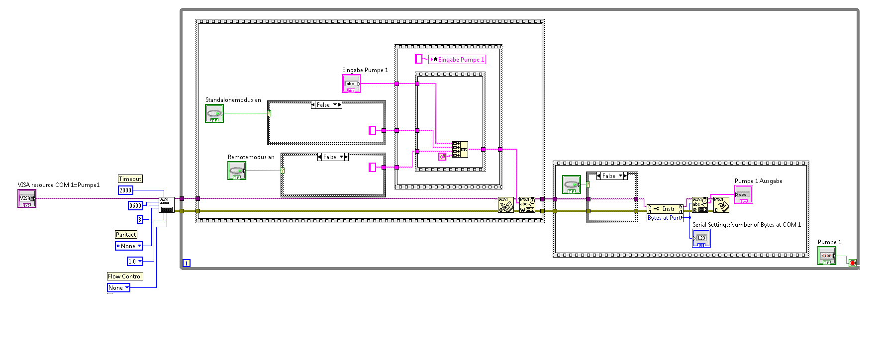 Natürlich würde ich es gerne so machen, dass der ganze Kram mit Visa Write nur ausgefuehrt wird, falls entweder einer der Schalter auf True steht, oder ein String eingegeben wurde. Meine Idee: Den Status von den Schaltern über ein logisches "Oder" verknüpfen. Zusätzlich müsste halt noch überprüft werden, ob etwas im Eingabefeld steht, also quasi wieder True oder False. Da weiß ich leider nicht, wie das mit Labview möglich ist. Das könnte quasi so aussehen: If "Empty String" then false else True. Die 3 könnte man dann über ein weiteres "Oder" verknüpfen und an eine Case Structure führen. Soviel zu meiner Idee. Das ganze sollte wenn möglich dann auch alle 500 ms überprüft werden.