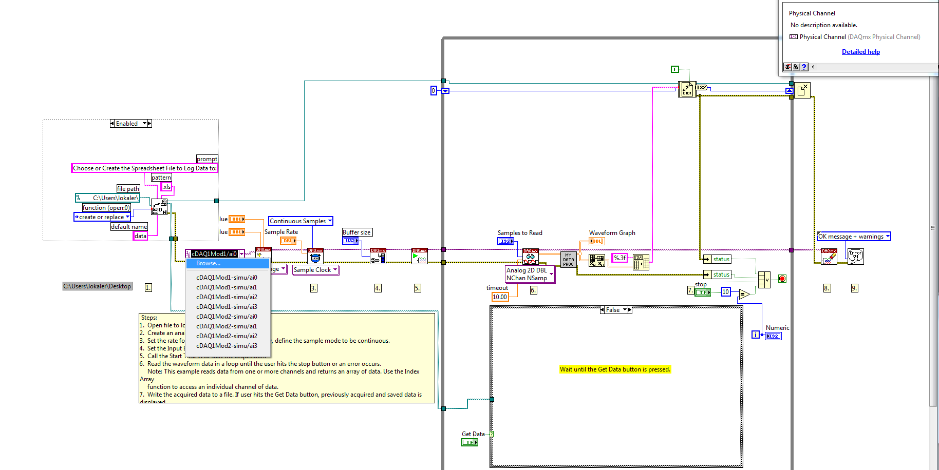 Mein Problem ist jezt, dass ich unter Labview nur die simulierten Channel/Tasks angezeigt bekomme und nich die realen, wenn ich hier z.B. "Browse...." anklicke. Wenn ich die simulierten Channel ausmache, dann wird da garnix mehr angezeigt, und das gilt für Channel sowie Tasks. (Das Bild ist aus einem der Beispiel VIs)