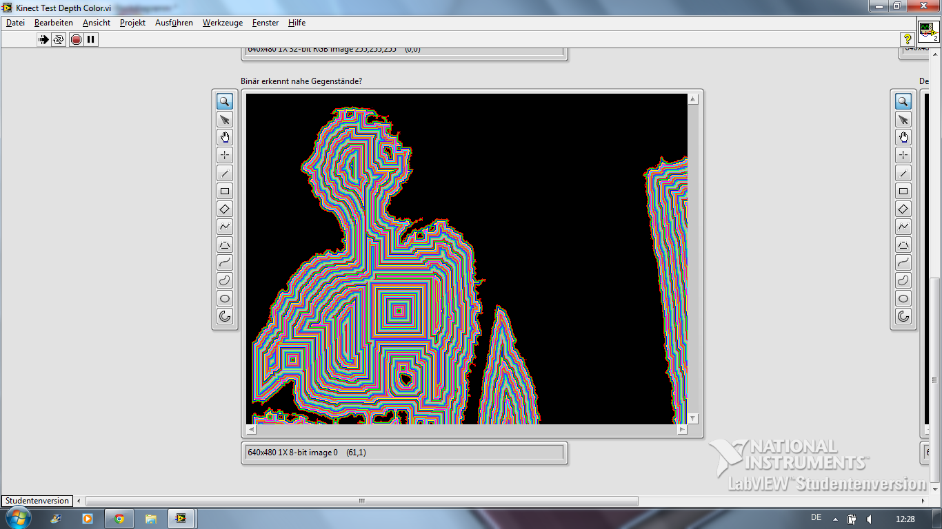 Ist es möglich das Video das die Kinect bzw. die Xtion macht mit dem Vision Assistent oder ähnlichem bei Laufzeit auszuwerten also über das Live Bild den Filter zu legen? Bisher habe ich es mit Hilfe des Kinethesia Toolkits und einem Beispielprojekt (https://decibel.ni.com/content/docs/DOC-16978 ) geschafft das beide Kameras ein Tiefenbild ausgeben. Und auch das man über ein einzelnes Bild einen Filter legt wenn es davor abgespeichert wird.