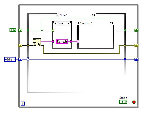 Öhm ... ich hab's mir noch nicht angeschaut aber ich glaub ich suche was viel einfacheres! Ich will im VI eine Menueauswahl simulieren und nicht in einem externen Programm. In manchen Programmen will ich keine Eventstruktur benutzen und polle deshalb mein Menü. In einem Case-frame refreshe ich z.B. mein FP und genau das will ich auch programmatisch auslösen können. Mit einer Eventstruktur wäre das kein Problem. Auch so bekomme ich das gewünschte Case schon irgendwie aufgerufen. Nur dachte ich vielleicht geht's ganz einfach, wenn ich so tu als ob der Benutzer im Menü Refresh ausgewählt hat ...