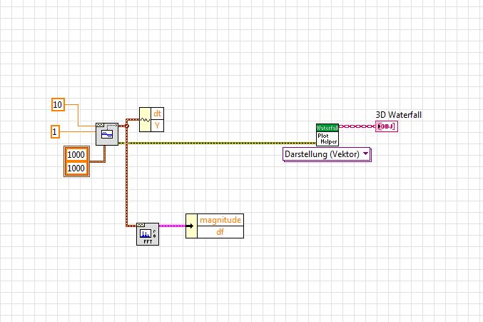Ich habe mal angefügt wie ich im Blockdiagramm angefangen habe, leider bekomme ich nichts funktionierendes hin da ich mir momentan nicht vorstellen kann wie ich was belegen muss, da die Z-Achse ja sowohl die Amplitude des Sinussignals als auch die Magnitude des Spektrums wiederspiegelt (lieg ich da richtig?).