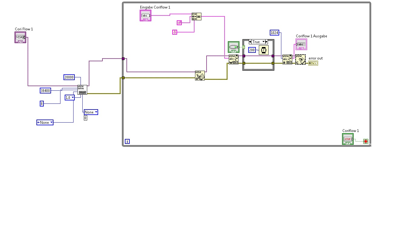 Ich möchte mit einem Mini-Cori-Flow verschiedene Parameter auslesen. Generell funktioniert dies auch, aber ich kann immer nur einmal auslesen, dann bekomme ich immer den Fehler 1073807339( Timeout Error). Woran könnte das liegen? Ich habe generell einen Delay beim Lesen von 200 ms eingebaut.