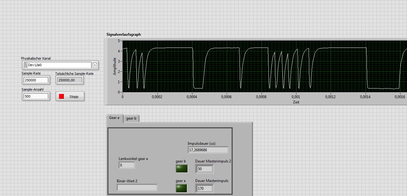 Das Signal lese ich über den Analogkanal ein, leider "wandert" das Signal und flackert, sodass die Messung immer nur zu einer bestimmten Zeit anfängt und dann wieder aufhört und die Messergebnisse hin und her schwanken.