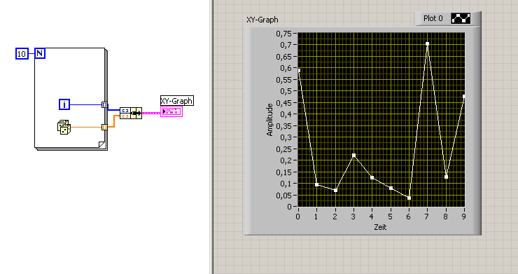 Folgendes: Das Programm besteht aus 2 Read From Spreadsheet Blöcken, eines liest mir die Spannungswerte aus und das andere die Stromwerte. Beide sind dann jeweils an den X-Eingang und an den Y-Eingang des XY Graphen angeschlossen. Wenn ich es laufen lasse, lade ich erst die U- und I-Daten von meinem PC, diese werden mir aber nicht als Kurve angezeigt, sondern jeder Punkt als einzelner Vektor?!?!