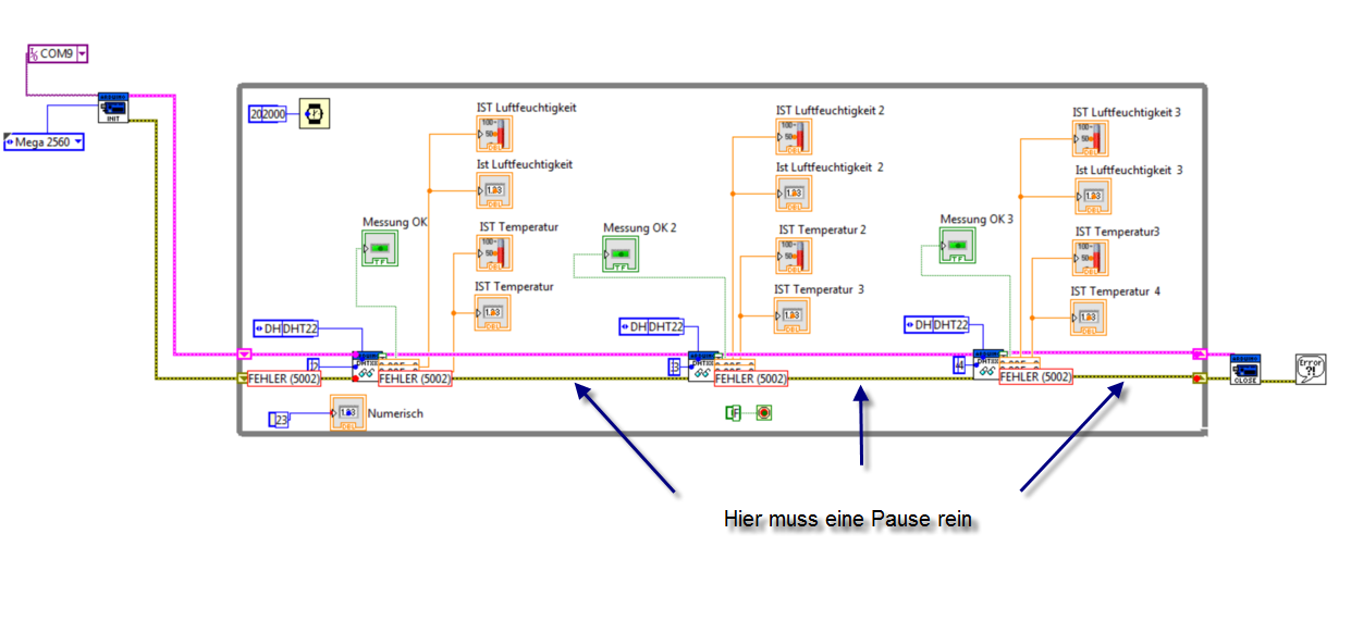 wann tritt der Fehler zum ersten Mal auf? Schon beim Init (links oben) oder erst bei der Messwertabfrage in der Schleife? Und falls das zweite trifft: sofort bei der ersten Abfrage oder erst bei der dritten?