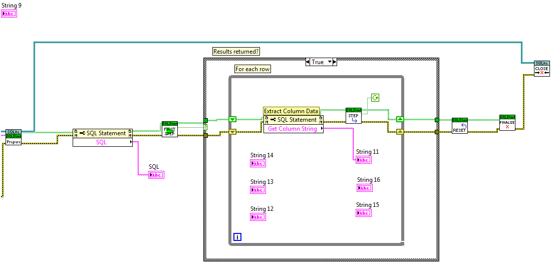 Was ist daran nicht zu verstehen? Das Controlfeld "String" ist der Ersatz für deine SQL-Rückgabe. Und dann habe ich dir 2 Möglichkeiten gezeigt, um die ausgelesenen Strings schrittweise zusammenzufassen. Einmal per Schieberegister, einmal per autoindiziertem Array. Beides Basis-Konzepte in LabVIEW, die du nach 2 Jahren intus haben solltest.