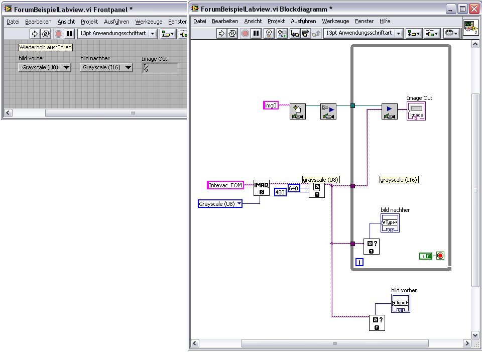 Leider wird der Bildtyp (Datentyp: IMAQ Image, Bildtyp: Grayscale (U8)) automatisch in „Grayscale (I16)“ umgewandelt, sobald der Datenstrang in eine While-Schleife gezogen wird (siehe ForumBeispielLabVIEW.vi /ForumVIBeispiel.bmp ). Ich brauche aber den Bildtyp „Grayscale (U8)“.