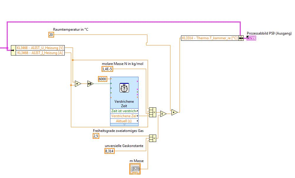 Ich möchte sobald die Leistung (UxI) der Heizung ungleich Null ist, den Temperaturwert (Thermo T Kammer) einmal abfragen und ab dann auf diesen Wert den berechneten Temperaturanstieg drauf addieren (delta T = (QxMx2)/(mxRx5)). Zur Zeit ist das Problem das die Temperatur bei jedem Durchlauf neu eingeht. Ich habe versucht den Temperaturwert beim Einschalten der Heizung in einem Schieberegister zwischen zu speichern. Aber nun bleibt in der while Schleife des Subvi das Programm hängen.