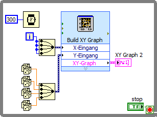 So, wie in meinem Beispiel dargestellt, trägt er beide Zufallswerte gegen die fortlaufende Schleifenzahl auf, füge ich einen weiteren Wert auf analoge Weise hinzu, zeigt mir die Verbindung zum XY Graph ein rotes X ("bricht").