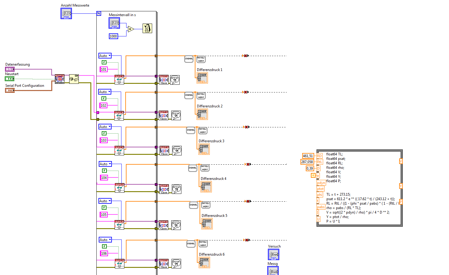 Dies soll für unterschiedliche Spannungen und unterschiedliche Differenzdruckmessungen möglich sein. Aus diesen Werten sollen verschiedene Diagramme erstellt werden, weswegen die Werte gespeichert/ festgehalten werden sollten. Ich habe versucht diese Problematik über mehrere Casestrukturen zu lösen. Allerdings wird die Programmierung recht komplex und unübersichtlich. Fällt jemandem eine elegantere Lösung ein?