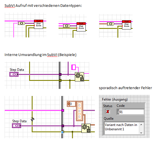 Von Zeit zu Zeit kommt es vor, dass das Variant-Eingangselement im SubVI nicht die Daten übernimmt, mit denen es gerade gestartet wurde. Es werden dann die Daten vom vorherigen Aufruf (ca. 5 Sekunden vorher) an das SubVI übergeben. Ca. 1 von 500 Aufrufen des SubVIs schlägt fehl mit diesem Verhalten und mein Programm bricht ab, da logischerweise die Datentypen nicht zusammenpassen. Soweit ich es überblicken konnte, sind die anderen Eingangselemente nicht betroffen, nur das Variant-Element. Das SubVI wird niemals parallel aufgerufen sondern immer hintereinander. Der Fehler hat sich verschlimmert, seit wir von Labview 8.2 auf Labview2015 umgestiegen sind. Mit 8.2 kam der Fehler vielleicht zweimal pro Woche vor, was noch akzeptabel war. Mit Labview2015 kommt der Fehler aber mehrmals täglich.