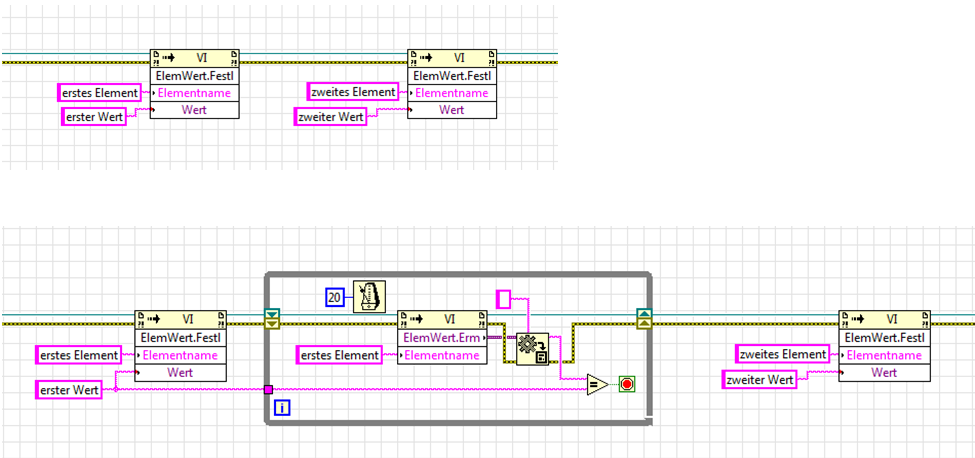 Zitat:Das Main-VI starte ich dynamisch und verwende die "Elementwert festlegen" Methode, um während des Programmablaufs das Verhalten zu beeinflussen.