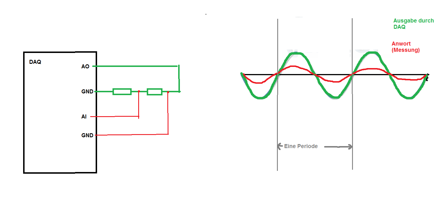 Nun möchte ich ja diese Anwort analysieren und weiterverarbeiten. Sprich ich möchte im gleichen Zeitraum, in dem eine Periode ausgegeben will auch wieder messen. Nur wie kann man das synchronisieren? Die Schleife zur Messung kann ja dann nicht einfach mit dem Start der ersten Schleife für die Analogausgabe synchronisiert werden, da ihre Dauer und der Startzeitpunkt ja undefiniert sind?