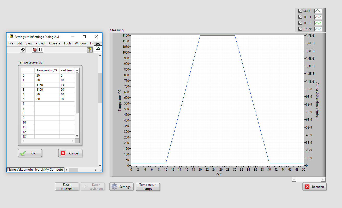 wie bereits im ersten Post beschrieben, mein Programm zeichnet 2 Thermoelemente und den Atmosphäredruck in einem Ofen auf. Mit dem Ofen werden verschiedene Temperaturregime abgearbeitet.
