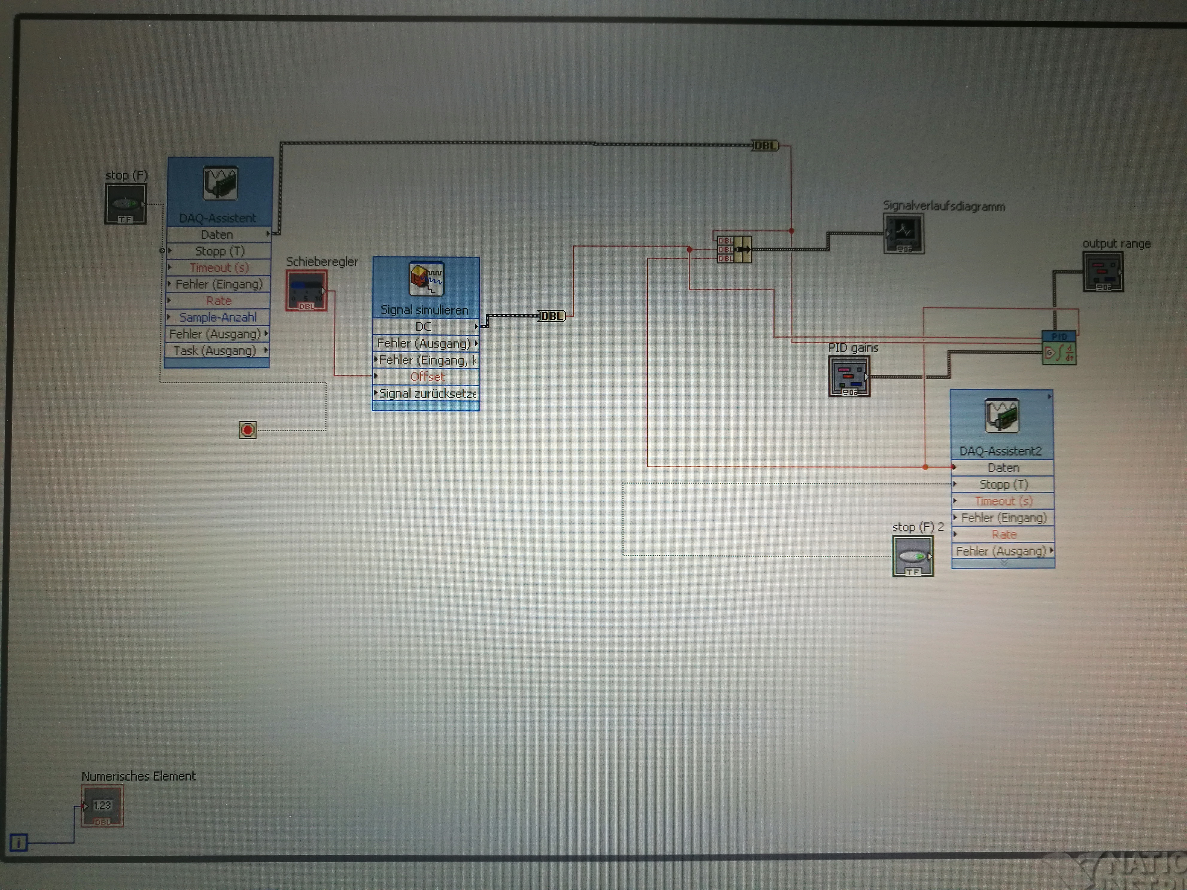 Bei Gelegenheit würde ich mich freuen, bei der nächsten Frage Hilfe zu bekommen. Ich möchte die Plots im Signalverlaufsgraph darstellen. Im Signalverlaufsdiagramm funktioniert es zwar, das Problem ist die Skalierung der x-Zeit-Achse. Ich möchte während es läuft eine oder zwei Perioden praktisch stehend darstellen lassen. Damit ich schnell die Periodendauer und Frequenz ablesen kann. Das Problem ist jedoch, dass beim Graphen die Signale nach der Konvertierung akzeptiert werden, jedoch nicht angezeigt, nur der Sinusverlauf, den ich selbst simuliere. Ich würde aber gern die ai0 und ao1 sehen.