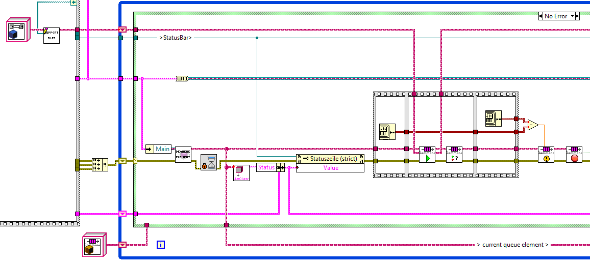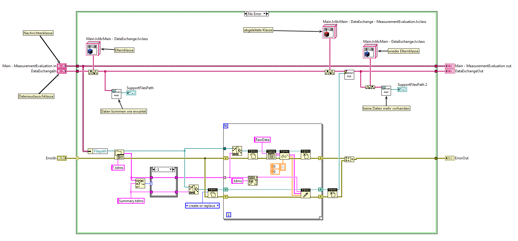 Ich habe zusätzlich zu meiner Nachrichtenklasse eine Datenaustauschklasse in meinem Haupt-VI. In der Nachrichtenklasse gebe ich dem auszuführenden VI alle Daten mit, die nur dieses VI benötigt. In der Datenaustauschklasse möchte ich Daten speichern, die ich in verschiedenen VIs immer wieder brauche (z.B. Login-Daten für meine Datenbank).