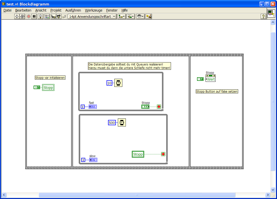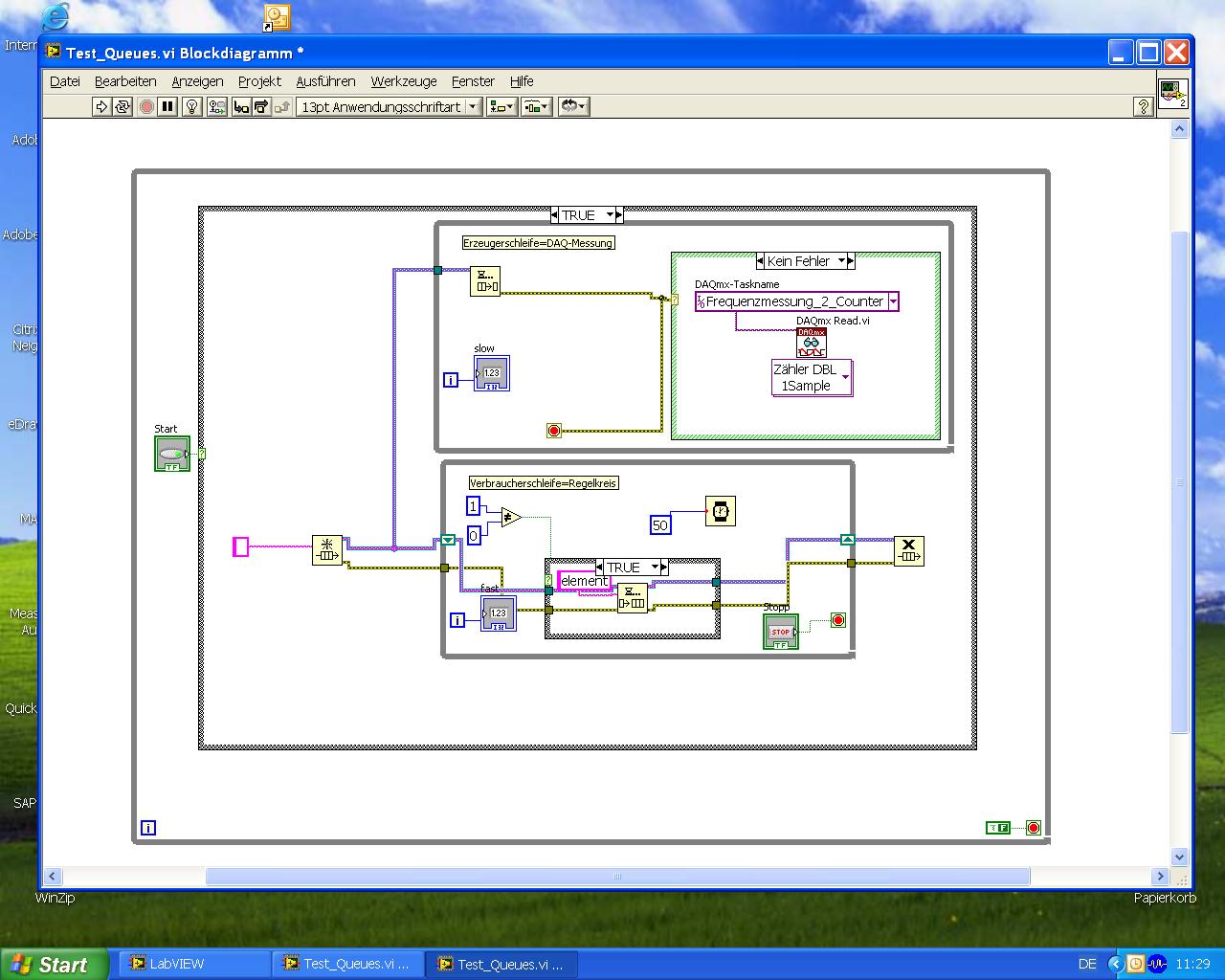 ich habe folgendes Problem: Ich erfasse in meinem Programm mittels DAQ eine Signalfrequenz mit der 2-counter-methode. Die Erfassung ist in eine While-schleife gepackt. Die Messung dauert 500ms. Parallel dazu soll eine While-Schleife laufen, die die Frequenz verarbeitet. Diese Schleife soll in Anhängigkeit davon, ob ein neuer Frequenzwert vorliegt oder nicht eine bestimmte Funktion ausfüllen (unwichtig hier). Die Schleife zur Erfassung läuft deutlich langsamer (500ms) als die Verarbeitungsschleife. Beide Schleifen sollen mit dem gleichen Stopp-Knopf gestoppt werden können. Nun passiert es aber oft, dass das Drücken des Stopp-Knopfes von der Erfassungsschleife ignoriert wird, da sie sich gerade in einer Messung befindet und nicht den Stopp-Knopf abfragt. Wie kann ich das Problem lösen?? Bin für jede Hilfe dankbar!
