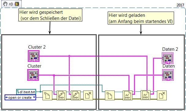 Ich möchte Daten speichern. Also beim nächsten Öffnen des VIs sollen die Daten aus dem abgespeicherten Cluster gelesen werden.