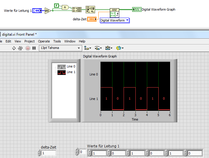 wenn du mit einzelnen "digitalen Leitungen" arbeiten willst, solltest du auch boolsche Arrays verwenden - anstatt über U8-Werte eben immer gleich 8 "Leitungen" zu definieren!