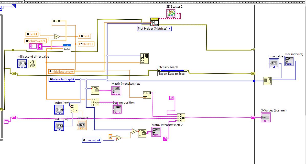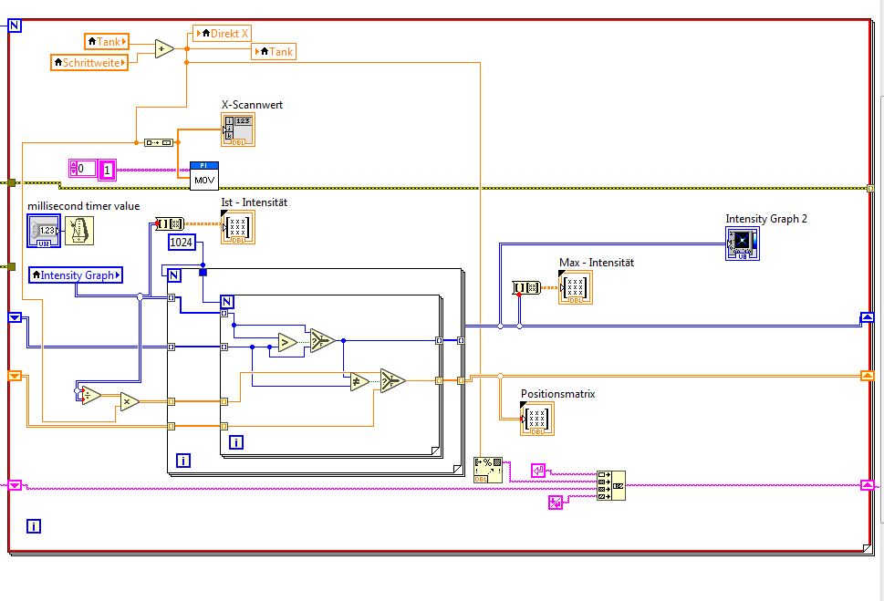 Meine Idee für LabView war: Ich setze beim ersten Schritt Einträge gleich dem X-Scannwert in einem neuen Array (bzw. in einer Matrix, wenn das denn geht). Anschließend fährt der Scanner einen Schritt weiter, mit deiner Schleife werden die Max-Werte behalten und kann ich dann meiner Matrix nicht einfach sagen, wenn neuer Wert behalten wird im Intensitätsarray, dann überschreib den Matrixeintrag mit neuem X-Scannwert.