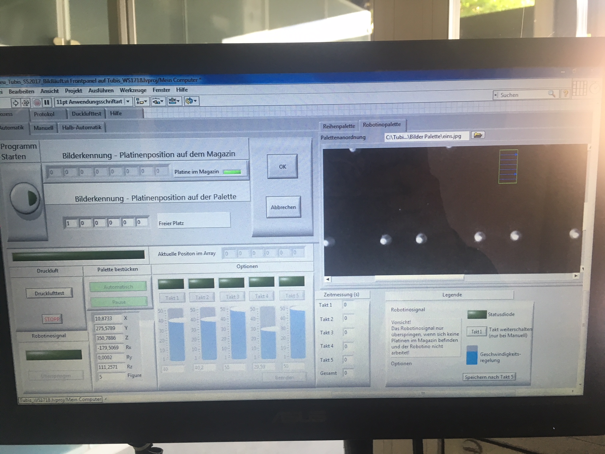 Zitat:2. Weil der Vision Assistent ein Bild auf vorhandene Platinen prüft (anhand von Kanten) und es gibt sechs Steckplätze, ist einer belegt bekommt er eine 1, ist frei eine 0.