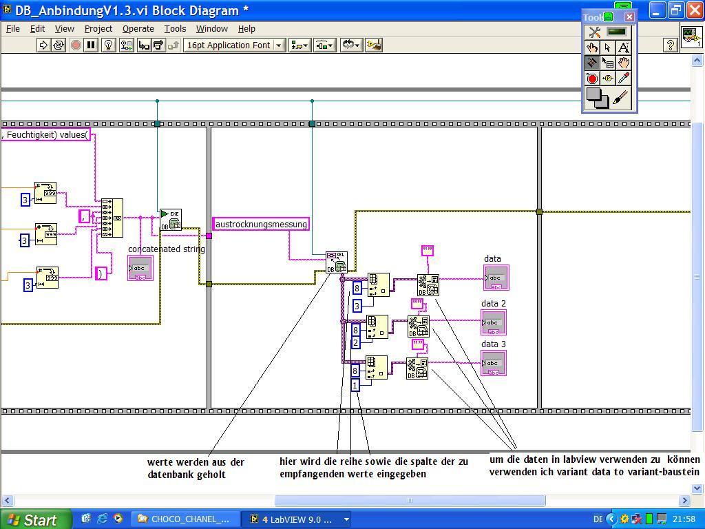 Es werden bei dem Programm Werte von einer Schaltung (Sensor) empfange und in eine Datenbank (mySQL) geschrieben. Das funktioniert ja schon mal ganz gut. Jetzt möchte ich aber die Werte die in der DB stehen in das Programm holen und mittles eines XY-Plote darstellen. Ich komme einfach nicht weiter. Wie wandle ich die Werte weiter damit LabVIEW damit klar kommt und wie verwende ich den XY-Plot richtig damit der die richtigen Spalen erkennt und sie auf die x u y spalte umsetzt?