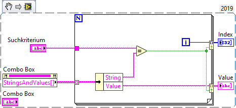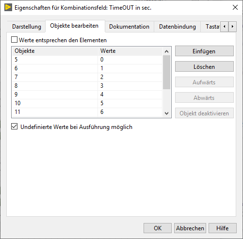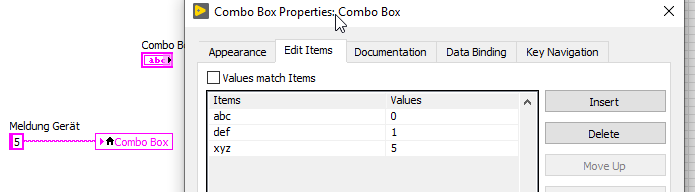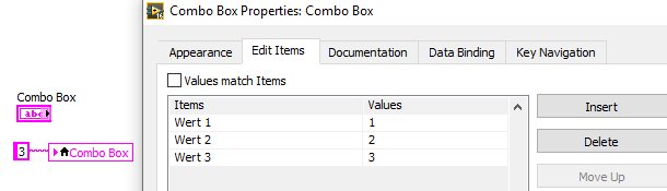 Der "Wert" einer Combobox, also das, was du bei einer Weitergabe per Wire per Probe abgreifen kannst, das ist ein Element aus der zweiten Spalte der "Eingabetabelle". Dargestellt im Frontpanel wird dir etwas aus der ersten Spalte "Objekte".