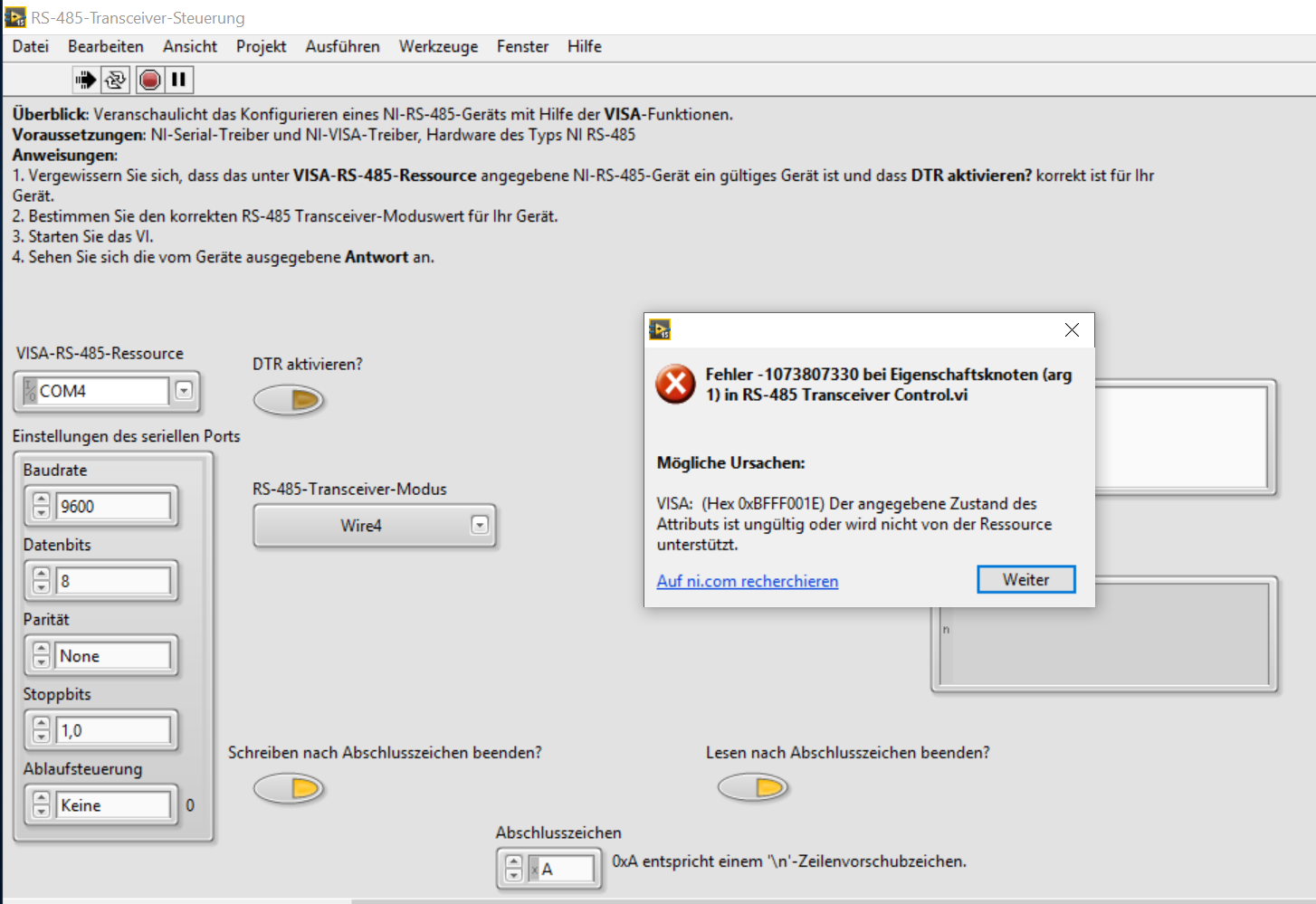 Benutzt du eine RS-485-Schnittstelle von NI? NEIN, also nicht wundern, dass es zu Fehlermeldungen kommt.