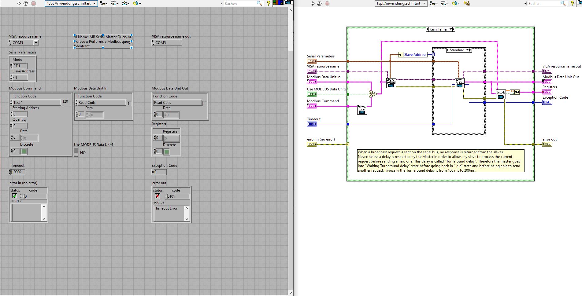 Den Block "MB Serial Master Query.vi" habe ich gefunden. Dort habe ich dann in der Ring-Control einen neuen Befehl eingefügt. Ist das korrekt wenn ich den Funktionscode in Dezimalschreibweise eingebe (also 0x78 als 120 für die "general Infos")?