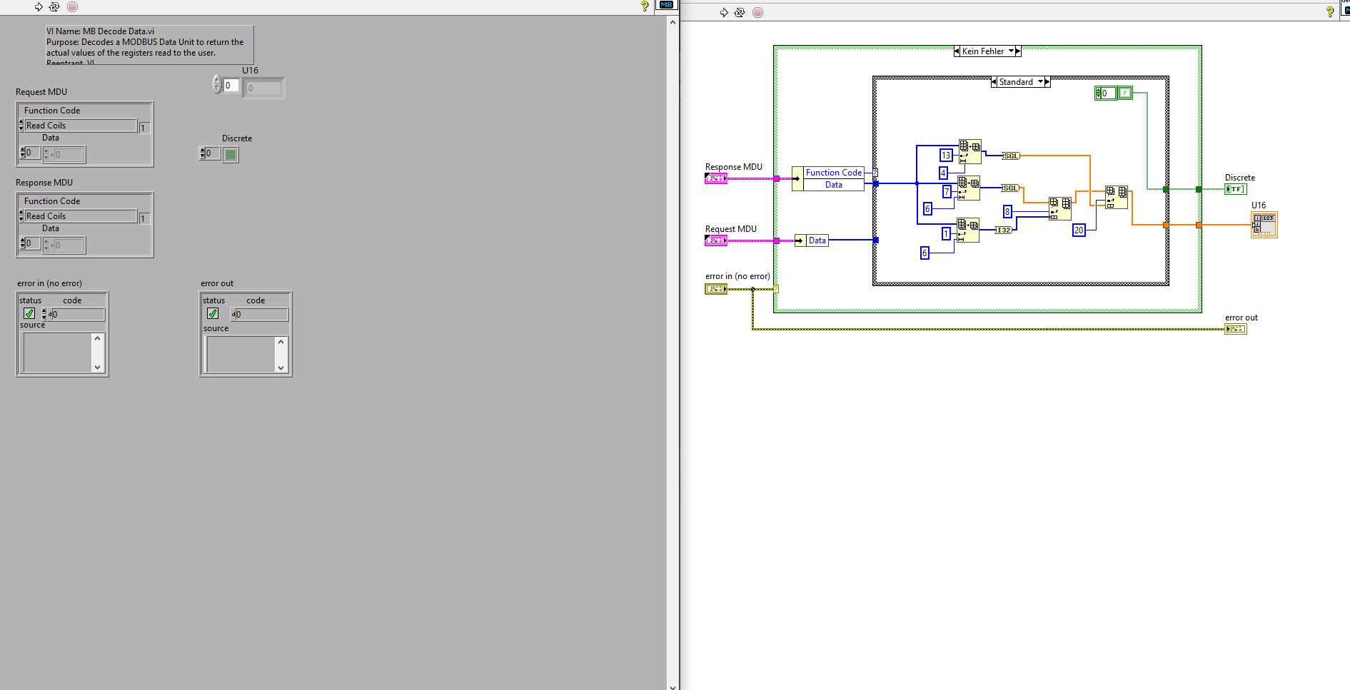 Wenn ich nun in den Block "MB Serial Master Query.vi" reinschaue erhalte ich das Fenster was im Bild "MB Serial Master Query_BS" zu sehen ist. In diesem Block kann ich nicht mehr viel ändern. Jedoch muss ich ja den Decode-Block abändern, da er meinen Funktionscode nicht kennt.