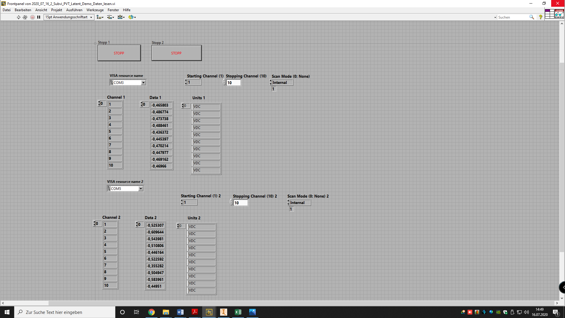 ich muss im Zuge eines Projektes für mein Studium ein Programm in LabView 2016 mit zwei separaten Keithley 2000 Multimeter schreiben. Das Programm soll aus den SubVI´s "Daten lesen" Daten verarbeiten" "Daten speichern" und "Daten visualisieren" bestehen. Ich hänge allerdings immer noch an der Kommunikation mit den beiden Geräten fest. Im Moment ist ein Programm zum Daten lesen geschrieben was auch funktioniert, aber noch nicht so wie ich es möchte. Bei jeder Messung die alle 10 Sekunden stattfindet wechseln auf dem Frontpanel die Channels hin und her. Dieses Problem bekomme ich nicht gelöst. Kann mir aus der Community bitte jemand helfen?