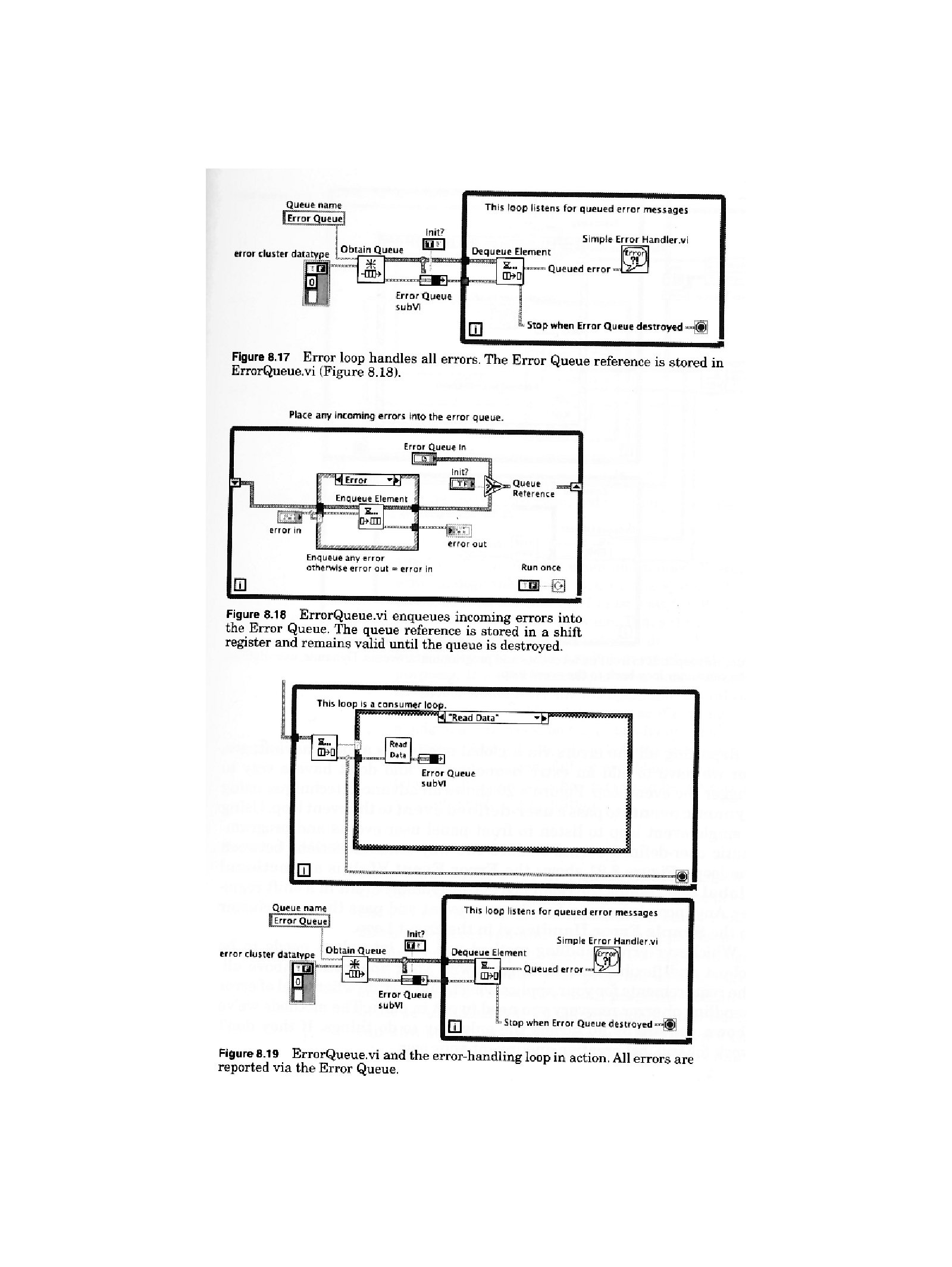 Fig 8.18 ist das "Error Queue subVI" (= dieses komische ganz kleine Symbol. welches in den anderen Bildern vorkommt) Es es nimmt die Fehler entgegen und bringt sie in die "Error Queue"