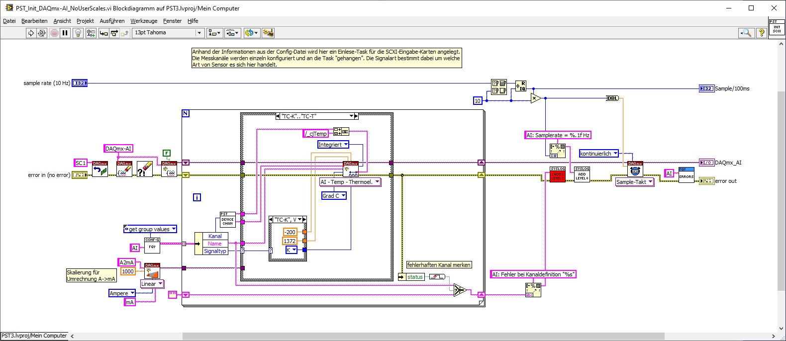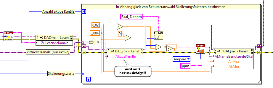 Zur Zuweisung der benutzerdefinierten Skalierungen... folgendes funktioniert NICHT (siehe relevanten Blockdiagramm-Ausschnitt): In der Schleife behandle ich die Kanäle einzeln und weise ihnen die vom Benutzer gewählte Skalierung zu (die Berechnungsformeln passen so, sind also nicht das Problem). Der Eigenschaft "Aktive Kanäle" im 1. Eigenschaftsknoten (habe auch schon versucht, diese Eigenschaft mit im 2. Knoten zu setzen - kein Unterschied) weise ich in jedem Schleifendurchlauf den Namen eines einzelnen Kanals zu (im Debugging überprüft - werden auch korrekt übergeben). Offensichtlich wird das aber komplett ignoriert, stattdessen erhalten am Ende immer alle Kanäle des Tasks (auch die nicht zu lesenden!) die Skalierung des letzten Schleifendurchlaufs! Warum ist das so? Was mache ich falsch?
