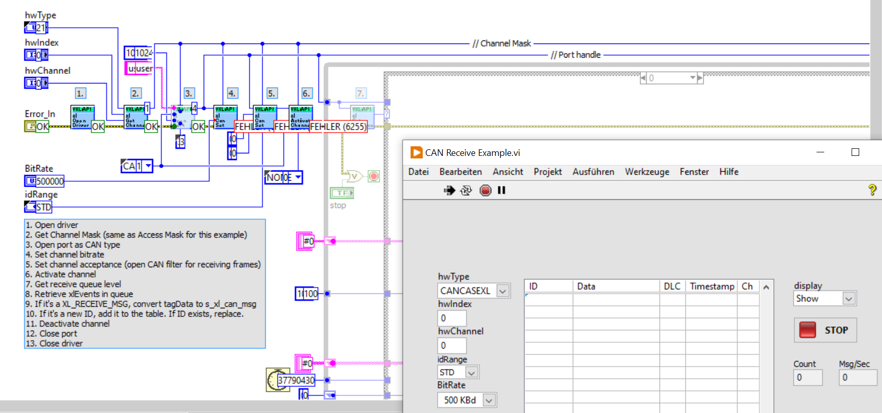 du solltest die Fehlermeldung nach 4. "Set Channel Bitrate" auswerten. Soweit ich gesehen habe, sind die Vector-VIs nämlich schlecht geschrieben und überschreiben mögliche Fehlertexte aus einem eingehenden Error-In.