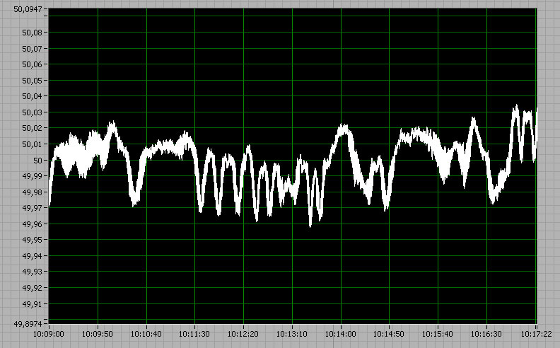 Es ergibt sich also eine Meßwertreihe, die alle 50ms (20Hz) den derzeitigen Frequenzwert anzeigt. Dieser Wert pendelt natürlich um 50Hz herum (+/- max. 0,15, meist viel weniger). Aber fürs Verständnis ist die Tatsache, daß der Meßwert einen Frequenzwert darstellt unerheblich. Man könnte auch annehmen es sei z.B. Volt.