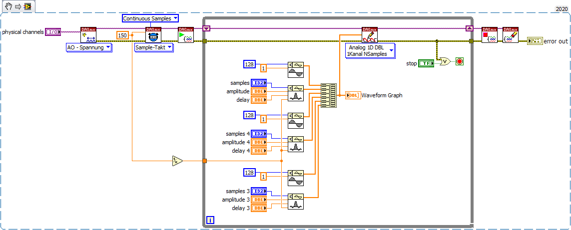 - Schau dir die BeispielVIs zum Thema "AO-Task" und "Continuous Samples" an!