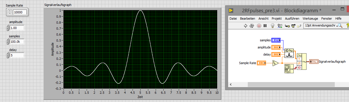 Das würde ich gerne machen, da es viel einfacher ist dort die Sampling Info anzugeben. Aber leider kann man mit den Bausteinen nicht wirklich einen Sinc erstellen. Ich hatte es mal mit dem Formula Waveform VI versucht und hatte immer eine Fehlermeldung wegen den Klammern bekommen und ich konnte keinen Delay einstellen.