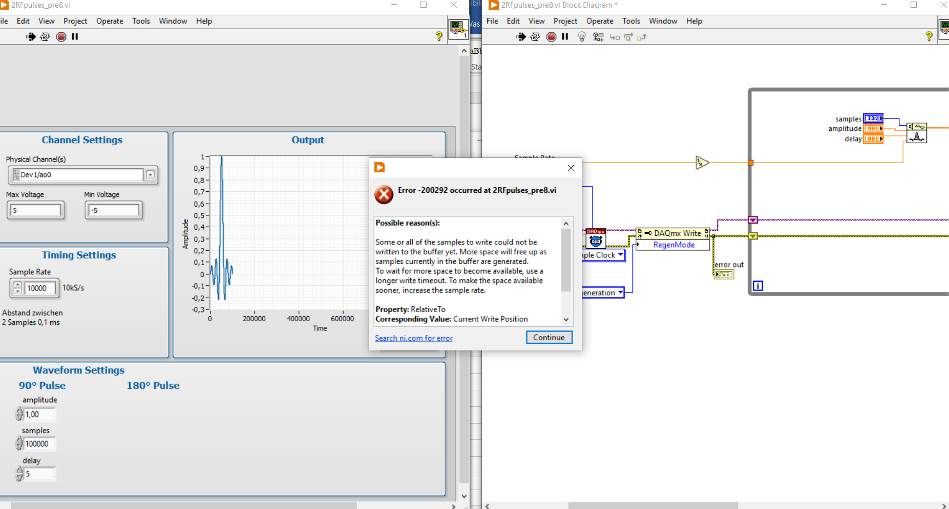 ich möchte mit meinem Programm mehrere Sinc-Impulse mit jeweils einer Pause dazwischen erzeugen. Diese Pulse der ersten zwei Pulse sollten eine Pause von 2,1 ms dazwischen haben und die weiteren jeweils eine Pause von 5,7 m. Ich bin mir leider nicht sicher, wie ich die Pause am besten erzeugen kann. Zurzeit wird in meinem VI eine Fehlermeldung angezeigt, weil das mit dem Wait VI leider nicht klappt.