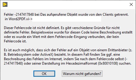 In der Zwischenzeit bin ich auch weg davon mit Office PDFs zu erstellen und erstelle jetzt .tex Dateien als Vorbereitung für PDFs und lass das mit Miktex eine PDF daraus erstellen, eben weil es ständig Probleme gibt. Ich ersetzte größtenteils auch nur Text in vorhandenen .tex Dateien und speicher diese wo anders, damit ichmich in LabVIEW nicht groß um die Formatierung und ähnliches kümmern muss.