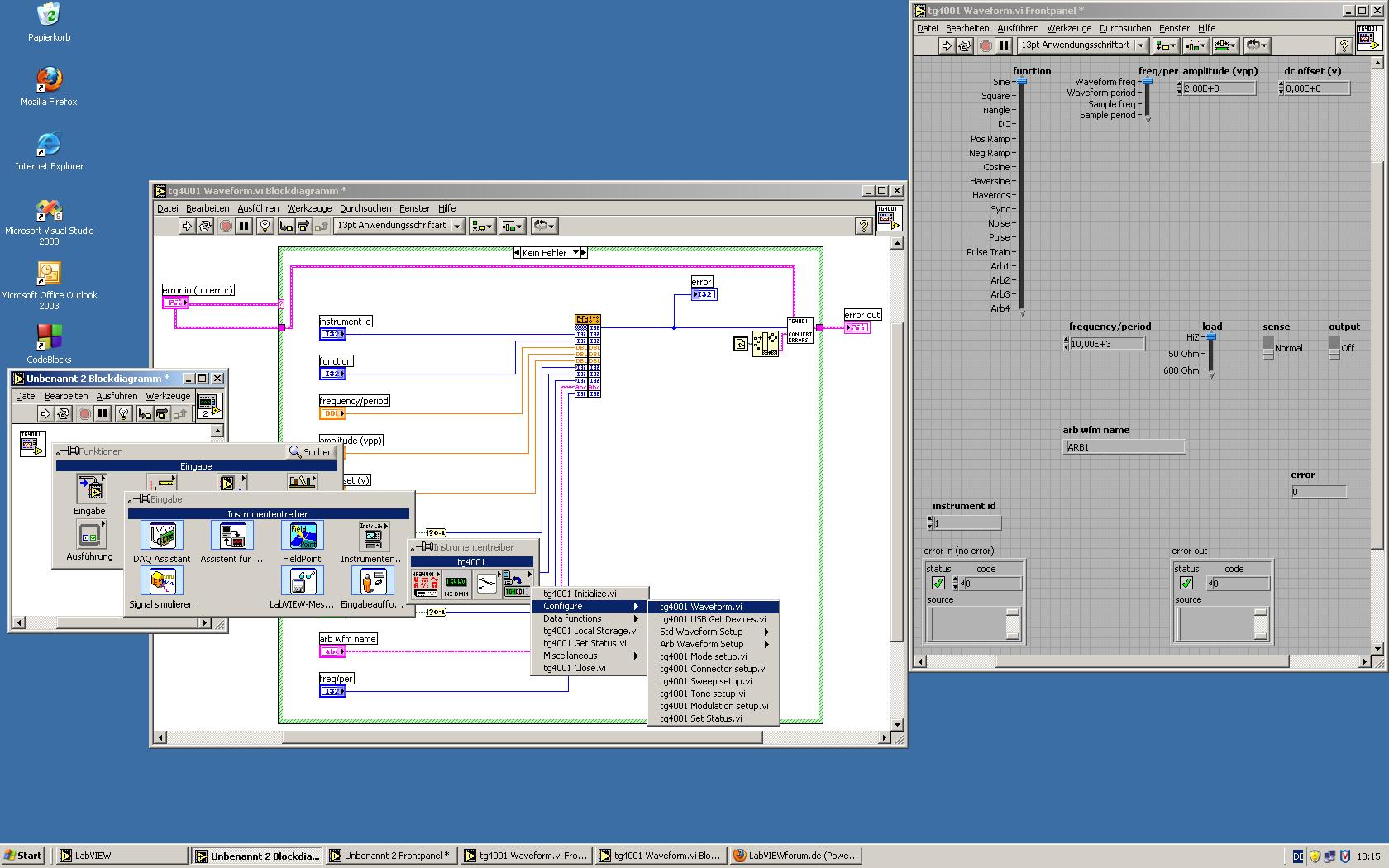 Zu dem Funktionsgenerator wurde eine CD mitgeliefert auf der man Treiber findet (normale Treiber und extra LabVIEW Treiber). Nach der Installation erscheinen in LabVIEW einige zusatz Bausteine mit denen man den Funktionsgenerator steuern kann.