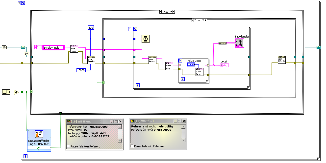So, mit gestärktem Magen widme ich mich jetzt wieder meinem Problem. Das angehängte VI ( start sampling_TRUE) zeigt, dass ab dem 2. Schleifendurchlauf der TRUE-Zweig durchlaufen wird. Dabei entsteht wohl der Fehler. Habe leider trotzdem keine Ahnung, wie ich das in den Griff bekommen kann.