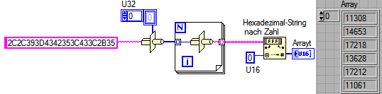 Mit der ersten Typumformung werden je 4 Zeichen zu einer U32-Zahl umgeformt. Das wird mit einer zweiten Umformung wieder rückgängig gemacht. Das Ergebnis sind wieder die gleichen Zeichen, allerdings gegliedet als Array zu je 4 Zeichen. Dieses Array läßt sich dann mit der Funktion Hexstring nach Zahl mit einem Rutsch konvertieren.