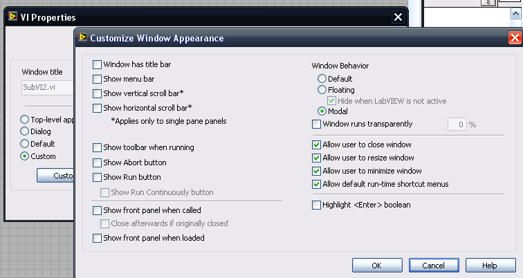 Aber ich mach' Dir Screenshots dazu (Die Einstellungen bei Window Appearance (vgl. Screenshot) habe ich bei SubVI1.vi und SubVI2.vi gemacht).
